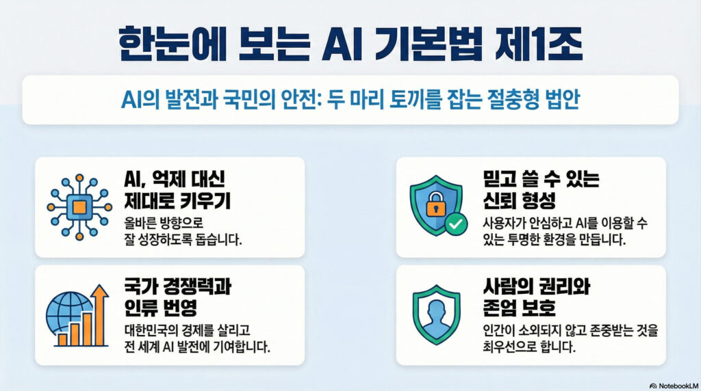 “이 법은 인공지능의 건전한 발전과 신뢰 기반 조성에 필요한 기본적인 사항을 규정함으로써 국민의 권익과 존엄성을 보호하고 국민의 삶의 질 향상과 국가경쟁력을 강화하며 인류의 번영과 지속 가능한 발전에 이바지함을 목적으로 한다.”